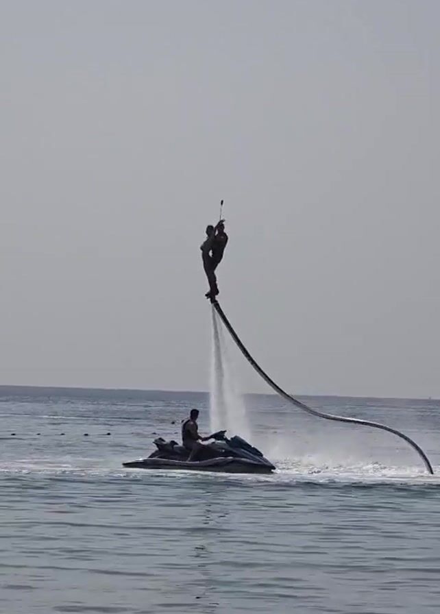 Two people are performing a water sport on the ocean. One person is on a jet ski while the other is standing tall atop a powerful column of water. A long hose connects the rider to the jet ski, which is ridden by the second person. The pair appear to be engaged in a choreographed performance. In the foreground, another person is swimming in the sea. The scene takes place on a clear, bright day with a light blue sky.
