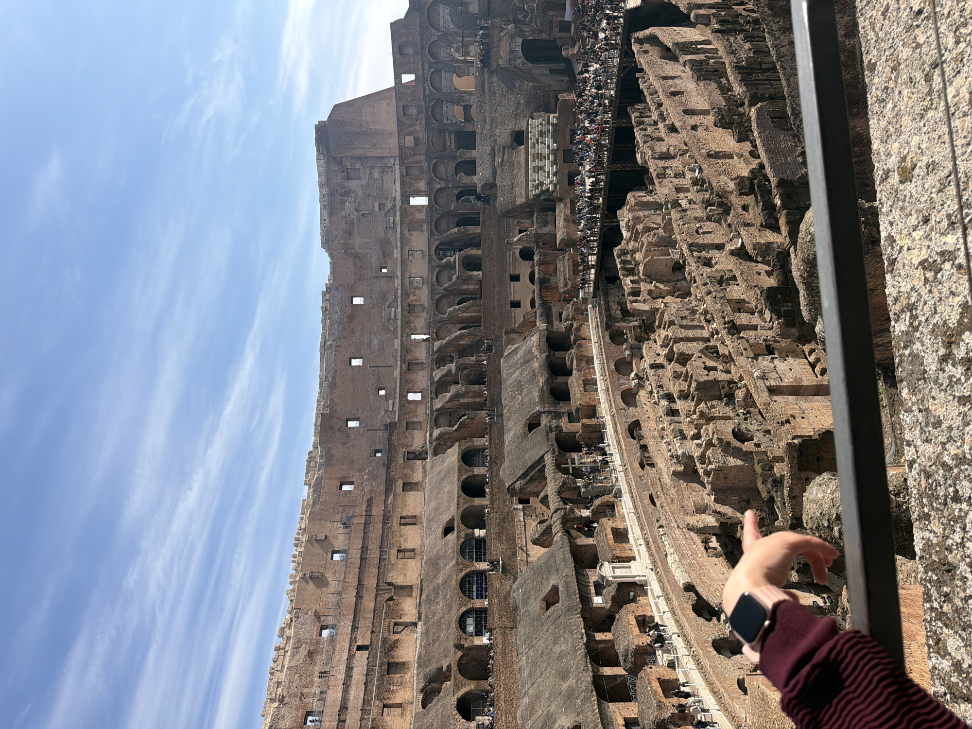 Colosseum in Rome, Italy. The structure is partially visible against a blue sky with streaky clouds. The interior reveals the complex structure of the amphitheater, with sections showing damaged walls and tiered levels. A crowd of people is seen on one of the levels. A hand with a smartwatch on the wrist is visible in the foreground, pointing towards the Colosseum, partially obscured by a metal railing and a stone wall. The orientation of the image appears to be rotated.