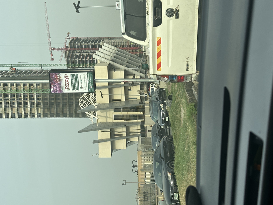 A hazy view from a car shows a city street with several parked cars along a grassy curb. Behind them are modern buildings with unique architectural features, including geometric shapes and globe-like structures. Construction cranes are visible near high-rise buildings, indicating ongoing development. A large billboard promoting event planning services is affixed to a pole along the street. A white truck partially obstructs the view.