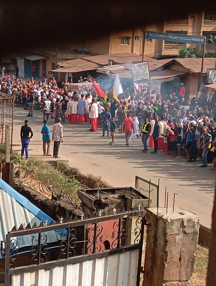 An elevated view captures a vibrant street scene in Onitsha, Nigeria, with a large procession filling a paved road under bright sunlight