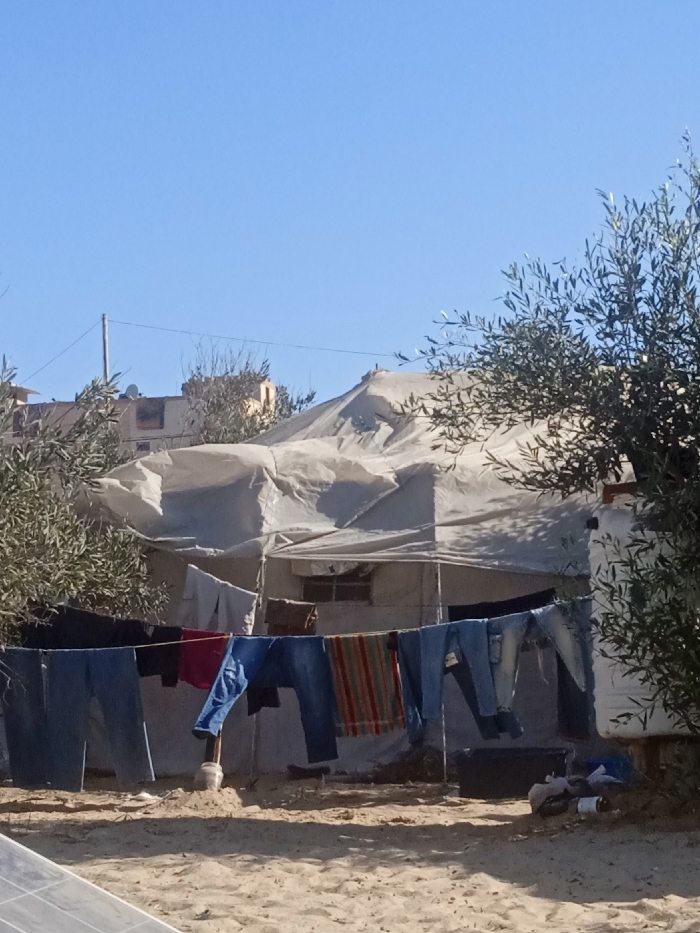 This image depicts a temporary outdoor settlement in Al-Mawasi, Palestinian Territories, under a clear blue sky. The central subject is an improvised shelter constructed from multiple light-colored tarpaulins or canvas sheets, draped over an underlying structure and secured. A window-like opening is visible on the front of the shelter. In the foreground, a clothesline is strung across the sandy ground, laden with various drying garments, including multiple pairs of blue jeans, a red shirt, a striped towel, and a white shirt. A white plastic bucket or container supports a section of the clothesline. To the right, a black plastic bin rests on the ground, with a small collection of miscellaneous items nearby. A portion of a solar panel is visible in the bottom-left corner of the frame. Olive trees with dense foliage partially frame the scene on the left and right. In the background, behind the main shelter, parts of more permanent structures with visible roofs and a utility pole with power lines are discernible. No individuals are visible in the scene. The ground surface is sandy and uneven.