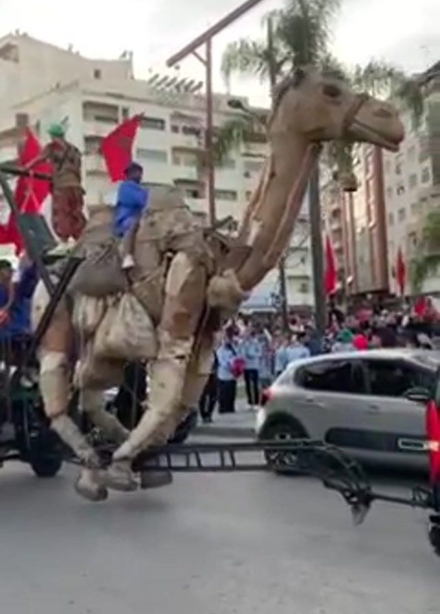 The video depicts a parade scene in what appears to be a city in Morocco, judging by the presence of Moroccan flags. The main focus is a large, articulated camel puppet mounted on a black wheeled platform. The puppet is beige in color and seems to be constructed from textured materials, giving it a somewhat rustic appearance. Several people are positioned on the platform alongside the camel puppet. One child is seated atop the camel, while other individuals, dressed in various costumes, are standing and waving Moroccan flags. There is also a large human puppet. Clowns dressed in colorful patchwork outfits walk alongside the moving platform. The background shows urban buildings and a crowd of onlookers. Several cars are visible in the street, indicating the parade is moving through traffic. The overall atmosphere suggests a cultural celebration or festival.