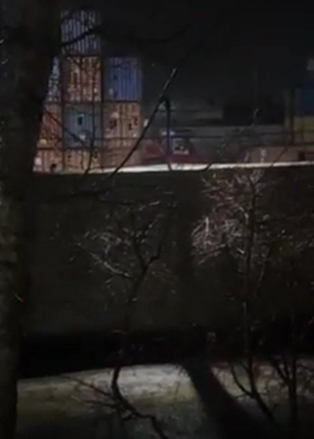 dimly lit, industrial scene at night