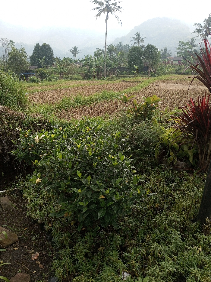 The image displays a rural landscape within Sandamal Eliya, Sri Lanka. The foreground is densely populated with green foliage, including a prominent shrub featuring several light-colored flowers, possibly white or cream. Various smaller green plants and grasses cover the ground, with a dark tree trunk visible on the far right edge and exposed soil or a narrow path on the left. The midground consists of a large, flat field covered in light brown stubble, characteristic of a recently harvested paddy field. This field is bordered by tropical vegetation, including multiple banana trees, other broadleaf trees, and several tall palm trees, one of which stands conspicuously in the center-top. The background features indistinct, hazy hills or mountains under an overcast sky. No individuals, direct actions, or interactions are visible in the scene.