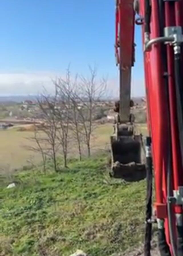 The video, shot from within the cab of a red excavator, shows the machine’s bucket filled with dirt