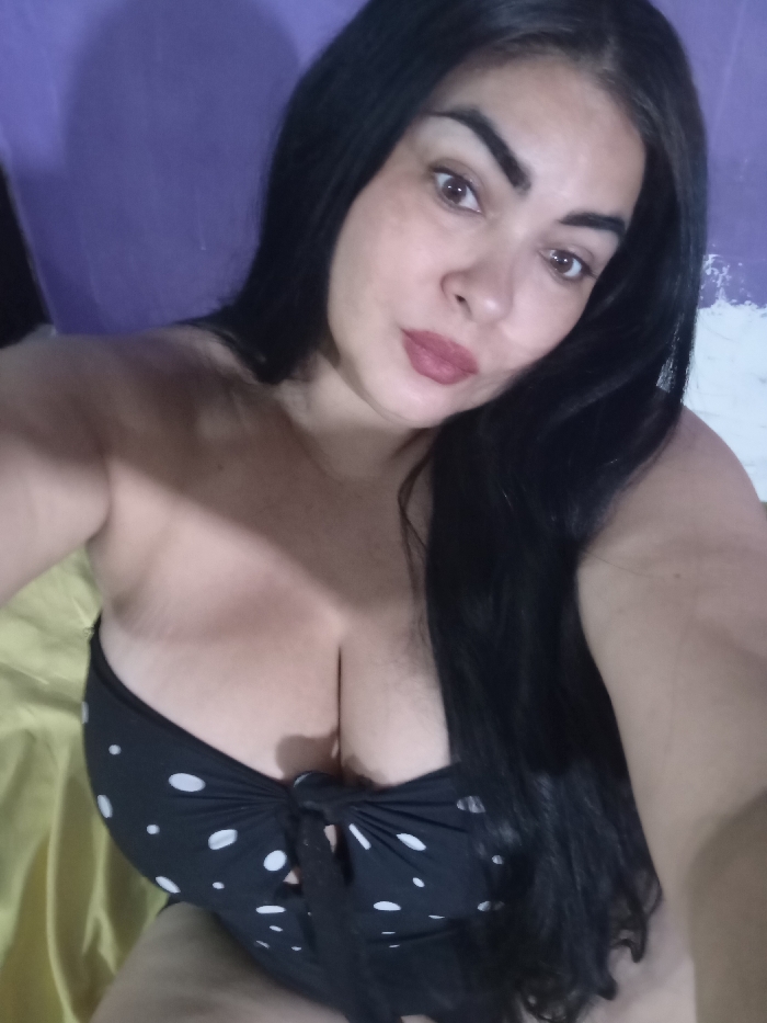 A forensic examination of the image reveals a medium close-up selfie of one adult female, approximately 30-45 years of age, situated indoors in the city of Unknown, Unknown. The subject has long, straight, dark hair, dark eyebrows, and brown eyes, with dark pink lipstick applied. She is wearing a black strapless top or swimsuit with white polka dots and a knotted detail at the front. Her shoulders and upper chest are visible. The background consists of a mottled purple wall to the left and top, with a lighter, possibly off-white or damaged section of wall visible on the right. Below the subject, a yellow fabric, possibly bedding or a blanket, is visible. The lighting appears artificial, originating from the front-left, casting soft shadows. The subject is looking directly into the camera, holding the device to capture a selfie.
