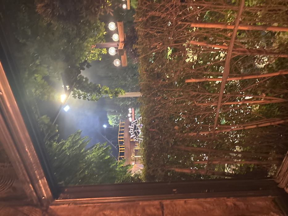 The image displays a nocturnal outdoor scene in Rukn ad-Din Municipality, Syria, viewed through a dark, possibly wooden, frame partially visible on the left side. In the immediate foreground, a dense, dark green hedge approximately one meter high extends across the lower half of the frame, interspersed with thin, vertical light brown stakes. Beyond the hedge, a landscaped area is illuminated by multiple artificial light sources, casting a white-blue glow and generating visible atmospheric haze. To the left-midground, a decorative structure features an upper level with a bright yellow railing and a light-colored, multi-spoked ornamental water wheel positioned below it. To the right-midground, several clusters of spherical, glowing white lanterns are suspended from dark, vertical wooden posts amidst the foliage. Overhead, a prominent bright white-blue floodlight is visible, illuminating surrounding trees with green leaves. The background consists of dense, dark foliage and further indistinct artificial lighting. No individuals are present in the scene.