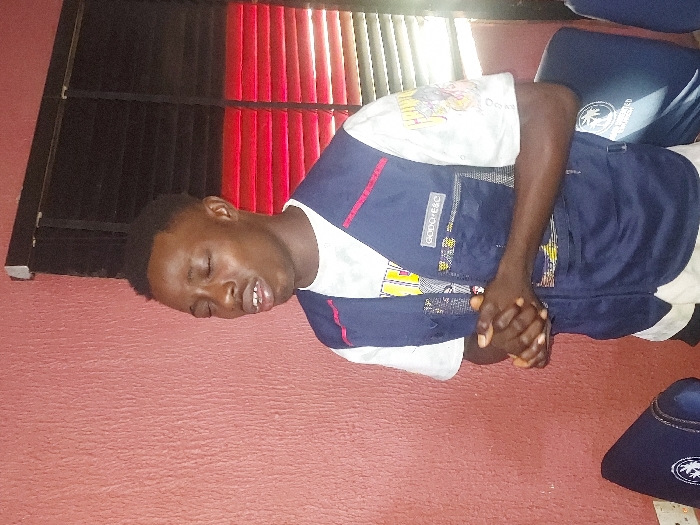 A young adult male, of dark complexion with short, dark faded hair, is depicted indoors in Onitsha, Nigeria