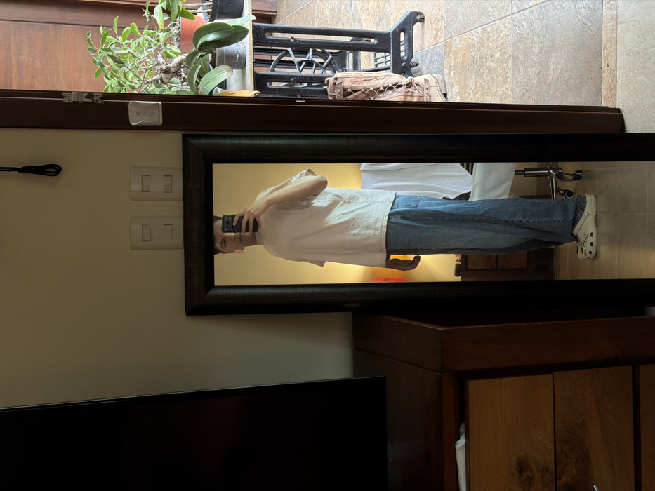 A person is reflected in a mirror, holding a phone and taking a picture. The individual wears a white t-shirt, blue jeans, and white Crocs. Behind them in the reflection, a white lab coat hangs. The mirror is positioned above a wooden cabinet, with a black television partially visible below. Above the mirror, a sewing machine and a plant rest on a ledge. Electrical outlets are on the wall next to the mirror.