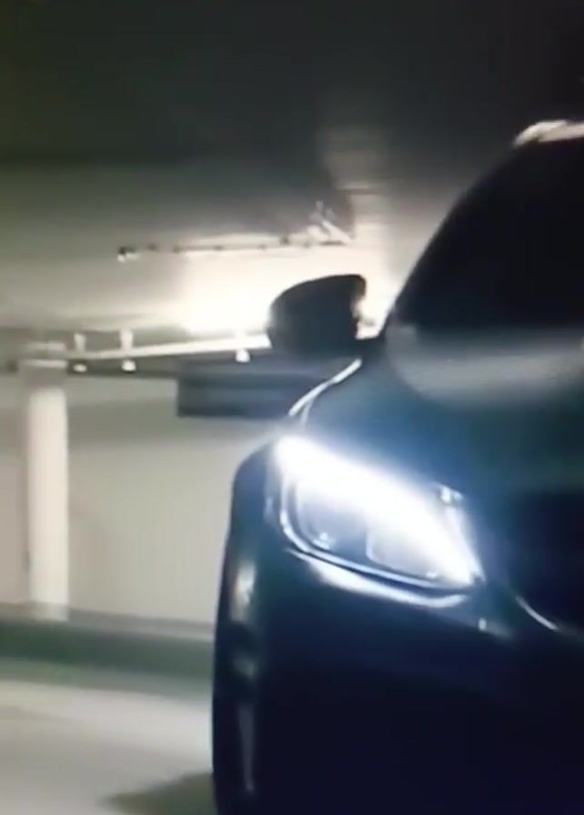 A dark-colored car is parked in an indoor parking garage with white pillars. The car's headlights are illuminated.