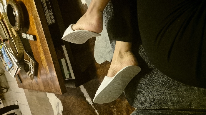 The scene depicts an interior domestic setting within a residence in Châtelaillon-Plage, France. In the foreground, the lower legs and bare feet of an individual are visible, wearing white open-back slippers with textured soles. This individual is seated on a dark grey, textured piece of furniture, likely a sofa or chair, and wears black trousers. Directly ahead, a dark wooden coffee table with a lower shelf occupies the midground. Arranged on the coffee table are a light-colored woven basket containing a stack of magazines and books, a dark brown, possibly metallic, decorative bowl or ashtray, a rectangular brown ceramic dish with light-colored stripes, and a silver-colored remote control. The flooring beneath the coffee table and extending into the background is covered by a patterned rug resembling a brown and white animal hide. Further in the background, on a light-colored tiled floor, the lower legs and white-shoed feet of a second individual are partially visible, indicating a standing posture. No direct interaction between the two individuals is discernible. The environment is illuminated with warm, ambient lighting.