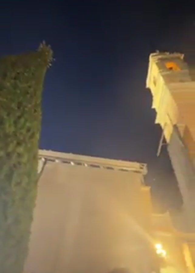 exterior of a church building at night. The building is illuminated with warm lighting, highlighting its architectural details. The video starts with a view of a tall, cone-shaped tree and pans up to reveal the church's facade. The church has a bell tower and a statue within a niche, adorned with a garland. In the background, a large white screen is visible. The sky is dark. There are people in the foreground, though they are obscured by the lower camera angle.