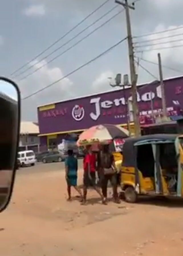 The video captures a scene on a dirt road in front of a building identified as "Jendol Superstores Bakery," with "shop