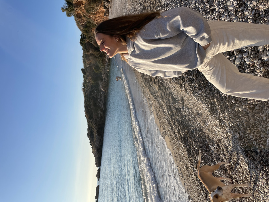 The image depicts a pebble beach scene in Drobnići, Montenegro. A young female, with long brown hair, is positioned on the right side of the frame, standing with her head tilted back, eyes closed, and smiling. She wears a light grey hooded sweatshirt and light-colored wide-leg pants, with her hands in her pockets. Sunlight illuminates her from the left. In the lower-left foreground, a medium-sized, short-haired dog with light brown and white fur stands on the pebbled shore, looking towards the left. In the mid-distance, a second individual is partially submerged and bent over in the shallow, light blue-green water. A second, lighter-colored dog is visible in the water near this individual. The sea features small waves breaking on the shore, extending towards a rocky, vegetated coastline on the left that recedes into the distance. Several rocky outcrops are visible in the water further offshore. On the right, the coastline rises into a reddish cliff with sparse vegetation. The sky is clear and bright blue.