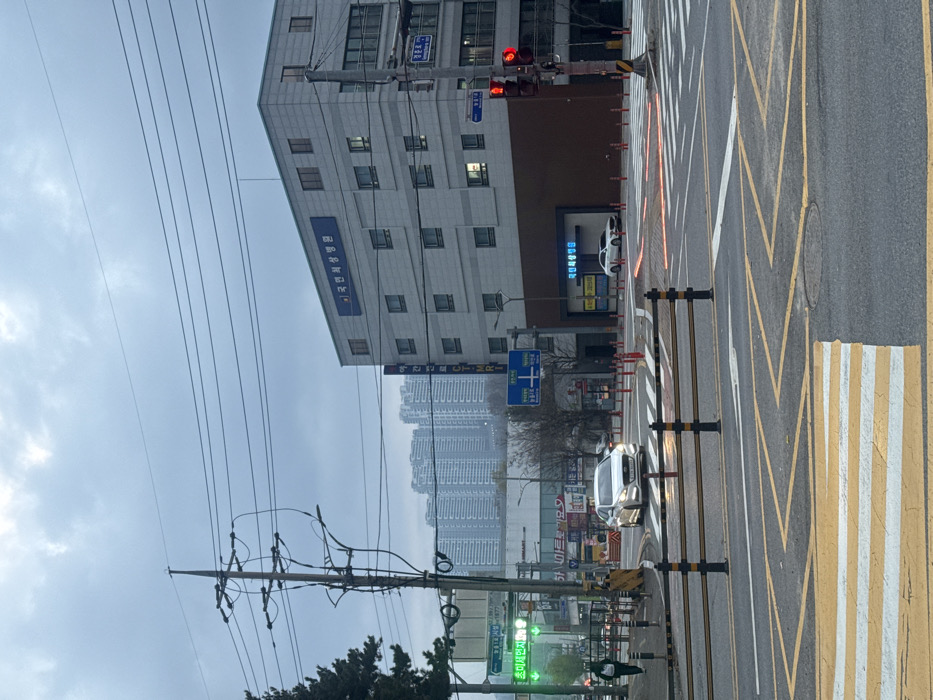 A street view dominated by a tall, modern building with a sign in a foreign language. Traffic lights are red. Across the street, a building with multiple apartments looms in the background. Yellow and white pedestrian crossings are marked on the street, with a silver car approaching. Overhead wires and a utility pole run along the left side. The sky is overcast.