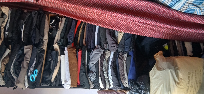 The image depicts a static indoor scene located in Sabon Gari South, Nigeria. The primary subject is a tall, narrow storage unit filled with numerous stacks of folded clothing. The clothing consists of various garments, including pants and shirts, in a range of colors such as black, grey, white, brown, beige, dark blue, and red, arranged neatly in horizontal layers on shelves or compartments. In the upper-left quadrant, a pair of light-blue plastic-handled scissors is visible, resting open on a stack of dark-colored garments. To the right of the stacked clothing, a red curtain with a small, repeating white geometric pattern hangs vertically, occupying approximately one-quarter of the frame's width. In the lower-left foreground, a large, light-colored woven sack with the text "GLOBAL LIMIT" partially visible is positioned upright. Adjacent to and slightly behind this sack, a crumpled black plastic bag is discernable. A section of a blue and white patterned fabric is faintly visible on the far right, behind the red curtain. The background on the left consists of a plain, light-colored wall. No individuals are present in the scene, and no overt actions or interactions are depicted.