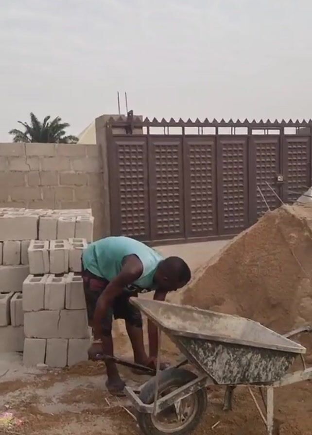 A man is working on a construction site. He's wearing a teal tank top, patterned shorts, and sandals. He uses a shovel to fill a wheelbarrow with sand from a large pile. Behind him is a stack of grey concrete blocks and a tall brown metal gate. The sky is overcast.