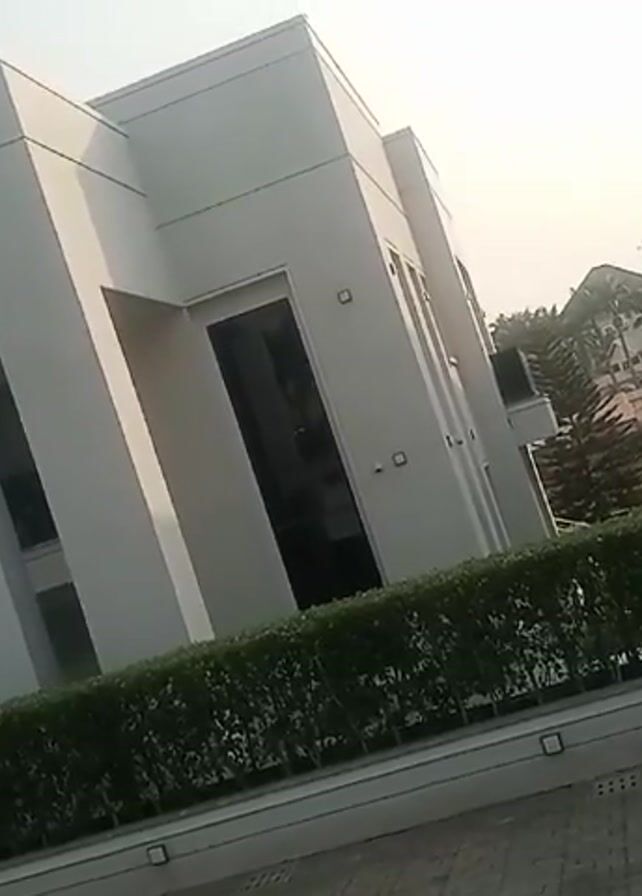 large, modern, white building with several windows and a large opening on the left side. The building is surrounded by a well-manicured hedge and a paved driveway. In the background, there are other buildings and trees. The sky is overcast.