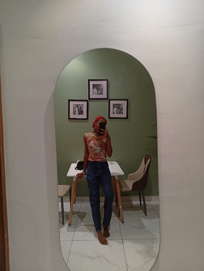 The image displays a lone individual taking a mirror selfie in an indoor setting within Abuja, Nigeria. The subject, a person appearing to be female, is captured from the chest to the feet, wearing a sleeveless, abstractly patterned top in orange and brown tones, dark blue jeans, and a red head covering. They are barefoot. The person holds a black smartphone to photograph their reflection in an arched, full-length mirror, while their right hand rests on a rectangular white table with light wooden legs. Reflected in the mirror, the background consists of an olive-green wall. Three framed black-and-white pictures, depicting indistinct figures, are mounted on this wall: one centrally above two others. A chair with a beige seat and dark brown back is positioned to the right of the table, and another chair with a light beige seat is partially visible to the left. The floor is covered with white tiles featuring grey marbling. The wall surrounding the mirror is a plain off-white.
