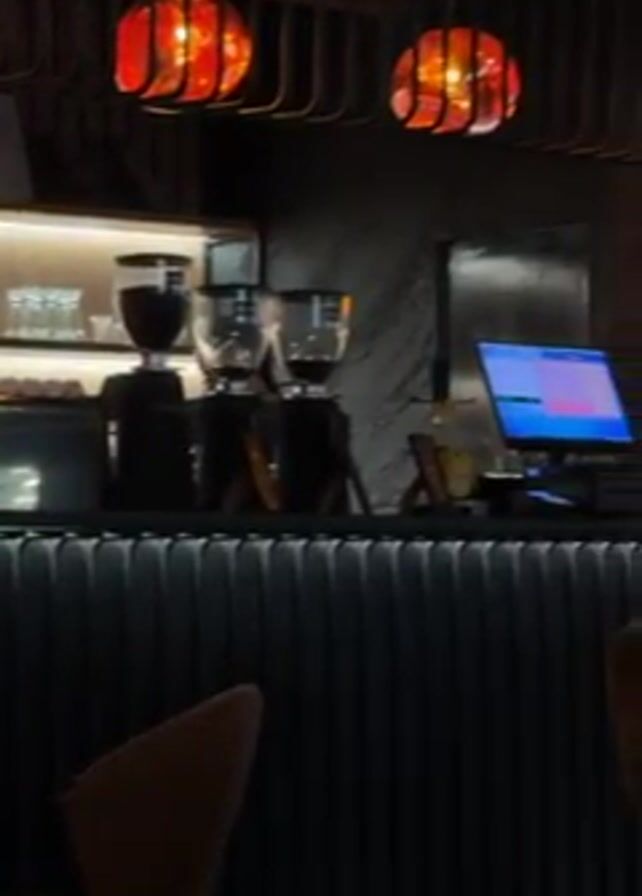 The camera slowly pans right, revealing a coffee shop