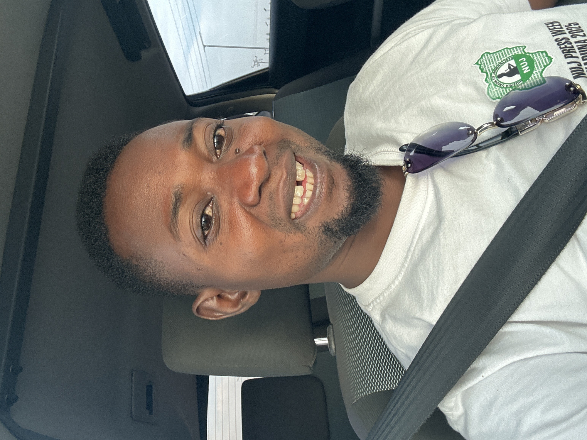 A man with brown skin is seated in a vehicle, wearing a white t-shirt and a black seatbelt. He has short, dark hair and a short beard. Sunglasses rest on his shirt near a logo on his shirt that says "NUJ PRESS WEEK MAIDUGURI, BORNO 2023, NIGERIA UNION OF JOURNALISTS". He is smiling and looking towards the camera. The interior of the car is visible. Through the sunroof, a partial view of the outdoors can be seen. The city and location are Unknown, Unknown.
