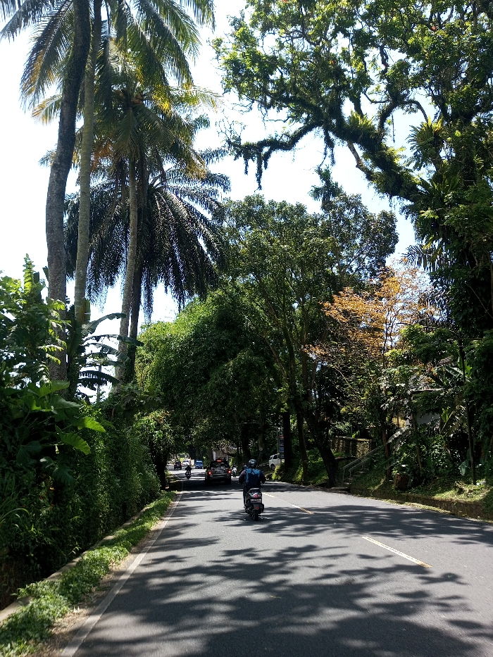The image displays a paved two-lane road in Tagtse Tashidingkha, Bhutan, under clear daylight conditions. A person, wearing a dark blue jacket and helmet, is operating a black scooter, traveling away from the camera in the lane furthest from the left edge. The asphalt road surface is marked with a solid white line on the left shoulder and double solid yellow lines dividing the lanes. Extensive tree shadows are cast across the road. Dense green vegetation borders both sides of the road. On the left, tall palm trees with visible fronds are prominent. On the right, various trees, some with epiphytes and moss-like growth, line the road, and one tree exhibits yellowish-brown foliage. In the mid-distance, several other vehicles, including a dark-colored car and at least one additional scooter, are visible, also proceeding away from the camera. A white vehicle and partially obscured structures are present on the far right side of the road, further in the distance, alongside an unreadable blue sign.