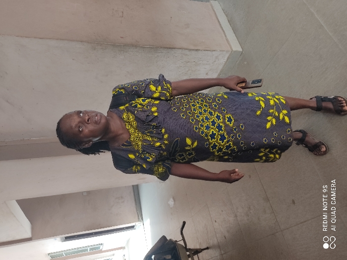A woman stands in a room, dressed in a knee-length dress with a blue and yellow floral pattern