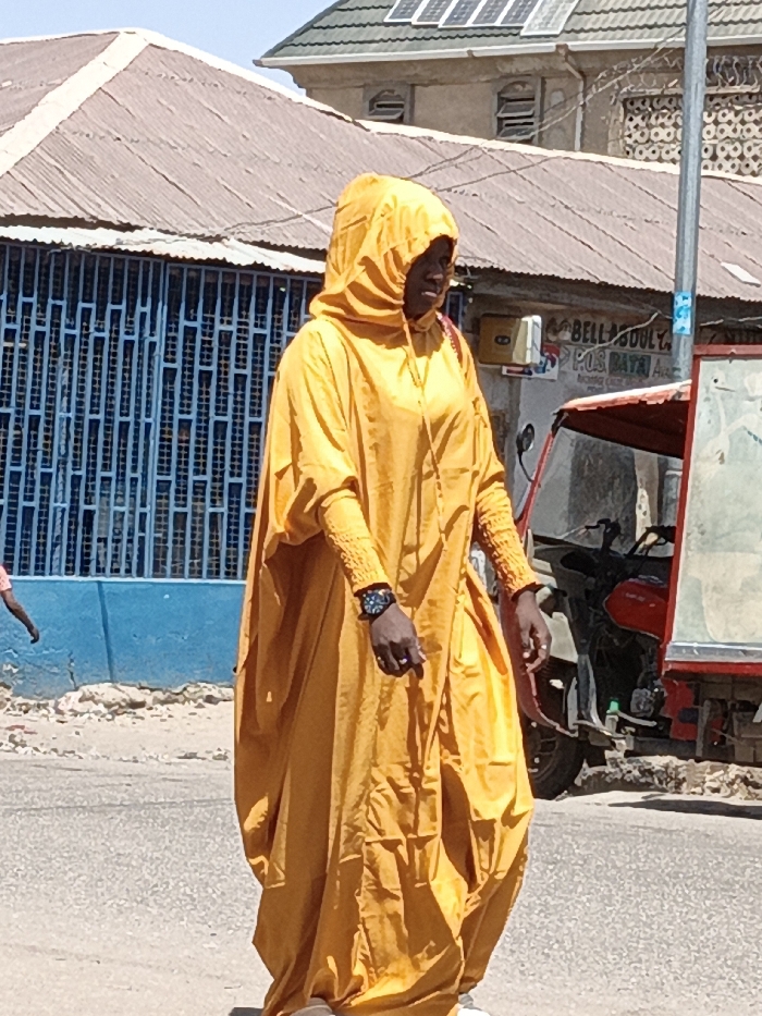 The image depicts a street scene in Gawuna, Nigeria, under bright daylight. A person, identified by visible dark skin on the face and hands, is centrally positioned, walking or standing on a paved surface. This individual wears a long, loose-fitting, hooded garment of bright yellow fabric, featuring elasticized or shirred cuffs on the sleeves. A black wristwatch is visible on the left wrist, and a ring is present on the left ring finger. White or light-colored footwear is partially visible at the bottom. In the immediate foreground on the far left, a lower leg and foot, with light pinkish-brown skin, are partially visible, suggesting another individual is moving out of frame. The background consists of multiple structures. To the left, a building features a light blue lower wall, above which is a prominent dark blue metal grate covering an entrance or windows, topped by a light brown corrugated metal roof. Further back and slightly to the right, another building stands with a more elaborate light green tiled roof, upon which several solar panels are installed. This building also shows features resembling arched windows or vents. To the right of the central figure, a grey utility pole is visible. Behind it, a red and white motorized tricycle, commonly known as a Keke Napep, is parked or stationary. A red motorcycle is partially visible behind the tricycle. Above the tricycle, signage on a building displays text, including "BELL SOULY" and "POS PAY A." The sky is clear, indicating sunny weather.