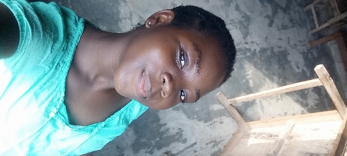 A young woman with dark skin, short dark hair, and an earring in her left ear gazes at the camera with a slight smile. She's wearing a light blue top. The background is a combination of textures: a concrete-like floor or wall and a wooden structure, possibly a table or ladder, in the upper right corner. The image seems to be taken indoors.