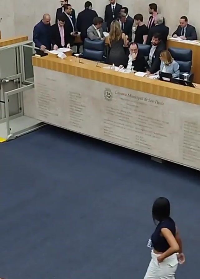 interior of a government meeting room. In the foreground is a woman with long, dark hair, wearing a dark blue top and light-colored pants. She is walking from left to right across a blue carpeted area. Behind her and to the left is a lift platform. In the background, a group of people, predominantly men in suits, are gathered behind a long, light-colored counter with a textured surface. Some are seated, others are standing and engaged in conversation. The words "Camara Municipal de Sao Paulo" are visible on the counter. Behind them is a wall with a Christian crucifix mounted on it, flags hanging on the left, and a podium is to the left of the group of seated and standing men. The overall atmosphere appears to be formal.