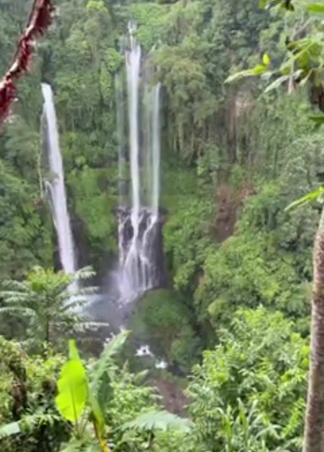 wide, long shot of a tiered waterfall surrounded by lush green vegetation. The falls consist of several separate streams of water cascading down a steep, rocky slope. The water is visible as white streaks against the dark rock and green foliage. The surrounding environment is a dense tropical forest with a variety of trees, shrubs, and ferns. A few of the plants in the foreground are large banana leaves. The video is shot from a slightly elevated position, providing a view of the entire waterfall and its surroundings. The overall atmosphere is tranquil and serene, with the sound of rushing water likely filling the air. There's a decorative red and white garland in the top left corner and a tree trunk on the right.
