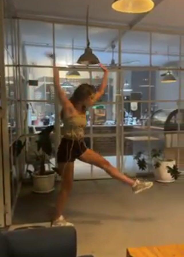 A woman in a tan top and black shorts does a cartwheel indoors. She is facing a large window, and beyond the window is a coffee shop with an espresso machine. She then turns away from the window and walks to a wooden table. There is a ceiling fan above her and a woven decorative object on the wall behind her. The floor is gray concrete. There is a gray couch in the foreground.