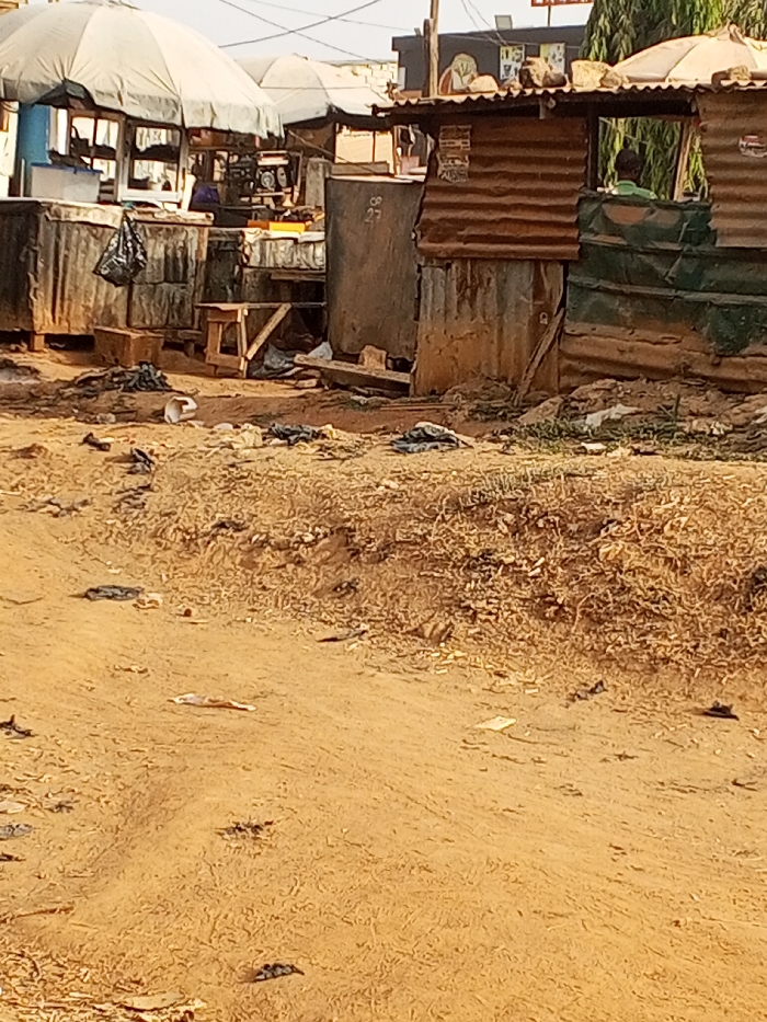 The scene depicts an informal commercial area within the city of Lugbe, Nigeria, under clear daylight conditions. The foreground consists of uneven, reddish-brown dirt ground, extensively littered with various items including black and white plastic bags, discarded paper, and unidentifiable debris. A low, horizontal band of dry, light-colored brush-like vegetation is present in the mid-ground, also interspersed with refuse. In the background, a series of makeshift market stalls and structures are visible. To the left, a stall is covered by a large, light-colored umbrella, with its base constructed from corrugated metal sheets, some rusted. A black plastic bag hangs from this structure. Behind this, another stall with a similar umbrella is partially visible. A small wooden stool or bench is positioned near the front of these stalls. Further to the right, a structure resembling a large container or booth made of rusted corrugated metal displays the number "27". Adjacent to it, a rectangular shack constructed from a combination of rusted brown and green corrugated metal sheets features an open, window-like aperture. The roof of this shack is also corrugated metal, with several rocks placed on top. Two individuals are present: one person is partially visible behind the counter of the leftmost umbrella-covered stall, obscured by other objects. Another individual, wearing a light green shirt, is partially visible through the aperture of the rightmost corrugated metal shack, with only their head and shoulders discernible, appearing to look outwards. No discernible active interactions or specific actions are captured.