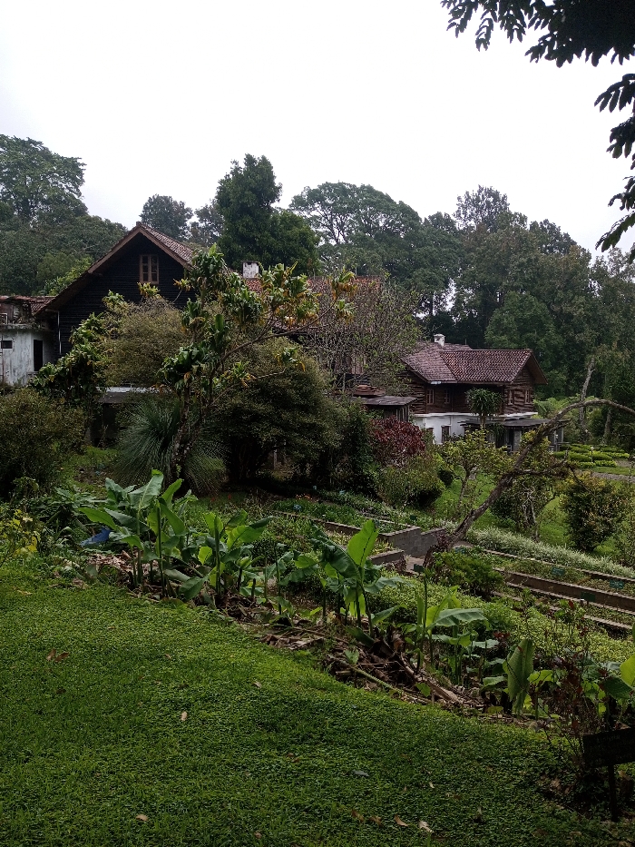 Two houses, both with brown roofs, nestle among lush trees and foliage. The house on the left is dark brown with a visible window, while the other appears to be constructed of logs. A verdant garden, filled with banana plants and rectangular plots, slopes gently towards the viewer. The overcast sky hints at a damp or misty atmosphere, typical of a heavily forested area.