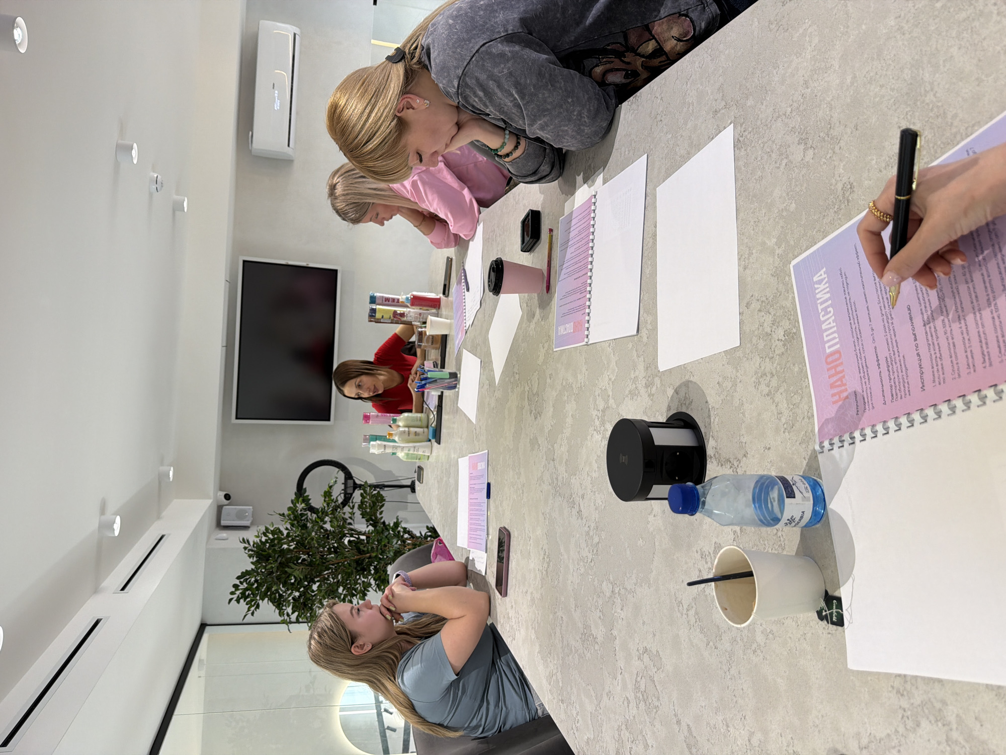 A brightly lit room, likely a classroom or meeting space in Moscow, Russia, is organized around a long, light-gray table surrounded by individuals participating in what appears to be a training session or workshop. The focal point is a woman on the right, actively writing in a notebook titled "NANO PLASTIKA". Other women are seen sitting along the table, some leaning forward attentively, while others seem more relaxed. The table also features a collection of notebooks, sheets of paper, beverages in cups and a plastic water bottle, alongside a variety of cosmetic products. The room’s background includes a flat-screen TV mounted on the wall, a white air conditioning unit, spotlights, and a decorative leafy plant.