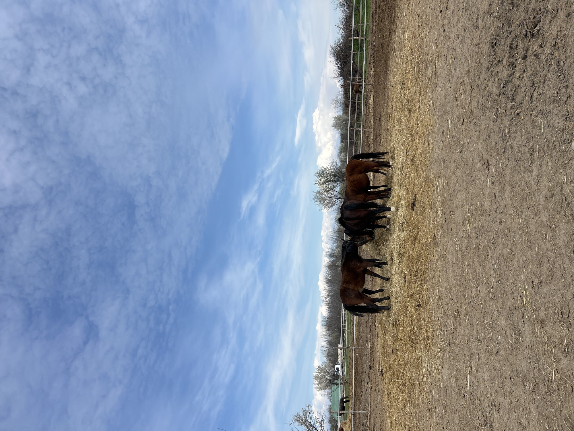 fenced area, likely a horse pasture, in a rural setting. Four dark brown horses are standing near the fence, along the border of a field with dry, yellow-brown grass/hay. The ground in the field is dry and dirt-covered. The sky is blue with scattered, fluffy white clouds. A line of bare trees and shrubbery is visible behind the fence. The precise location cannot be determined as Tsaratsovo, Bulgaria is not visible. There are no people visible.
