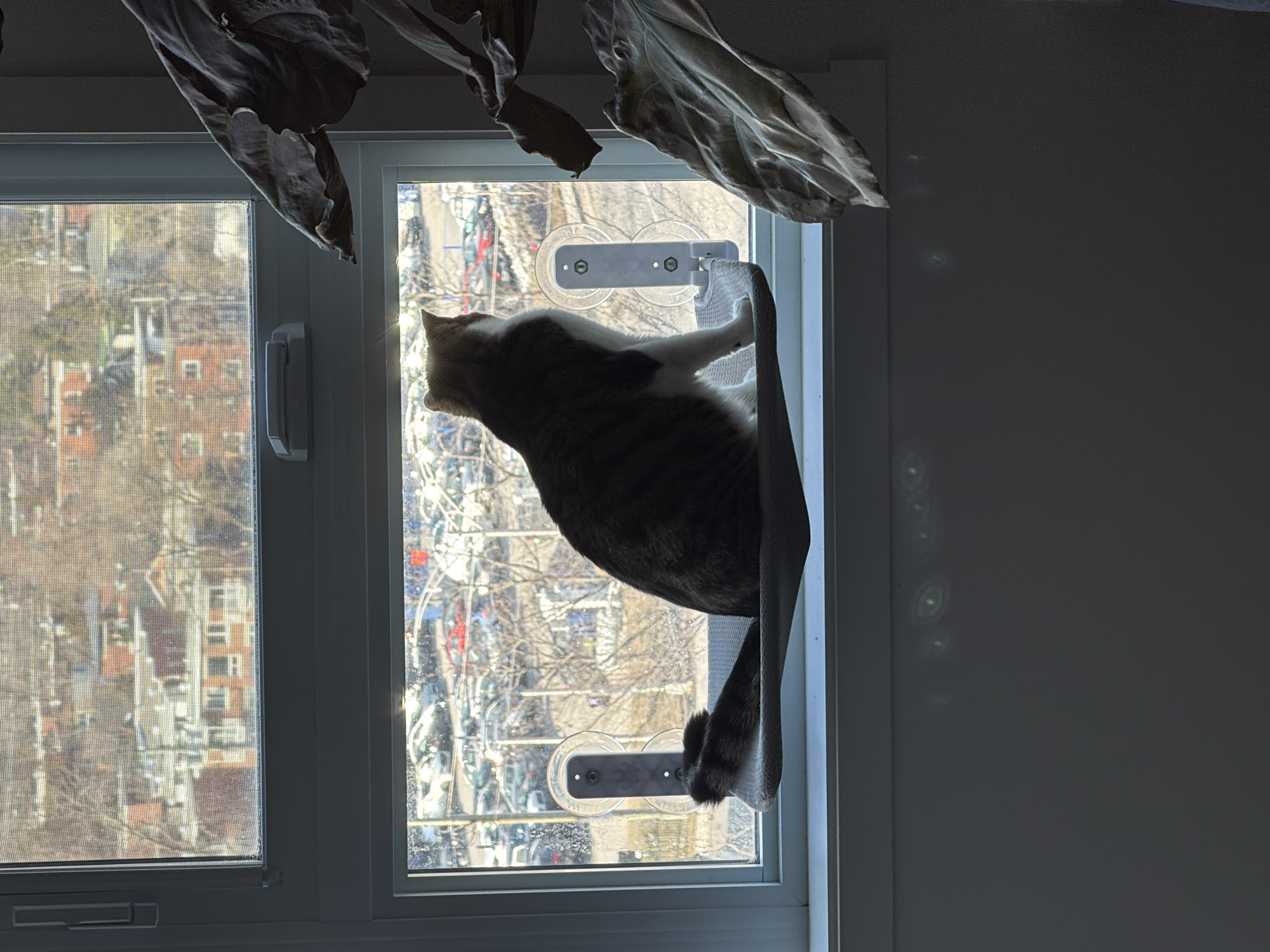 A gray and white cat is positioned on a window-mounted perch with suction cup attachments in a residential setting in Laval, Canada. The window provides a view of an urban landscape with multi-story buildings and parked vehicles. The room's wall on the right is a dark gray, contrasting with the lighter window frame. Above the window, some light-colored fabric or curtain is draped.