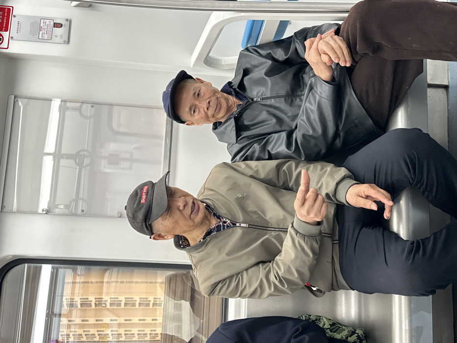 Inside a subway train in Tiaodeng, China, two older Asian men are seated