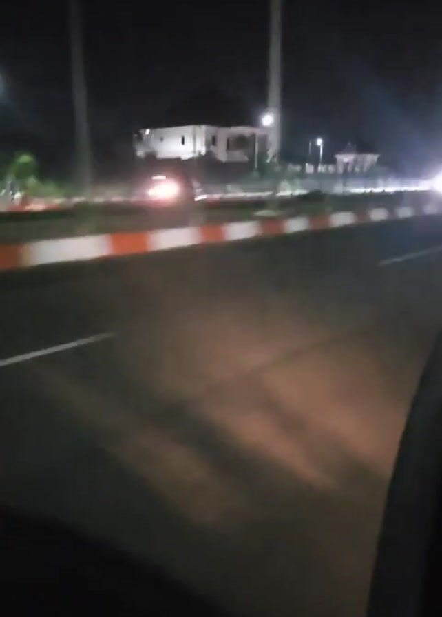 The video depicts a night-time scene from a moving vehicle on a paved road