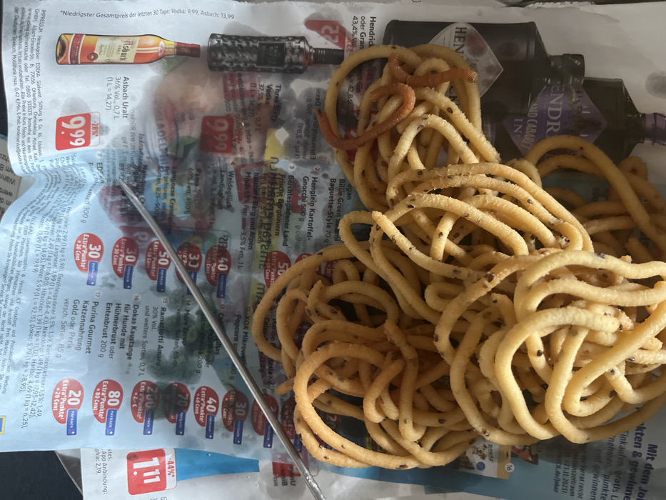 The image depicts an indoor scene in Tuttlingen, Germany, presenting a static arrangement of items on a surface covered by a German supermarket flyer. **Scene Elements:** * **Base Layer:** The immediate surface is covered by an open multi-page advertisement flyer, featuring "EDEKA" branding and German text. Advertisements for "Purina Gourmet Katzenahrung" (cat food), "Hühnerbrust" (chicken breast), "Ramazzotti Amaro," "Asbach Uralt," "Vodka," and "Hendrick's Gin" are visible, along with pricing and "Payback" loyalty program details. * **Primary Subject (Food):** A large, irregularly shaped pile of light beige to golden-brown fried snacks, likely a variety of Murukku, is centrally positioned. These snacks are tubular and coiled, and contain small, dark, embedded seeds. One distinct piece of a reddish-orange fried snack is intermingled within the pile on the right side. * **Objects on Flyer:** * A thin, silver-colored metallic skewer or probe lies diagonally across the upper-middle section of the flyer, partially resting on the snacks. * Two dark-colored bottles are partially visible on the right side, underneath and beside the snacks. One bottle is brown with a label indicating "Asbach Uralt." The second, largely obscured, shows part of a label with text consistent with "Hendrick's Gin." * Small, blurred green specks are visible in the background, near the top of the flyer, beneath the skewer. * **People:** No individuals are present or visible in the frame. * **Actions/Interactions:** All depicted items are stationary and arranged on the flyer.