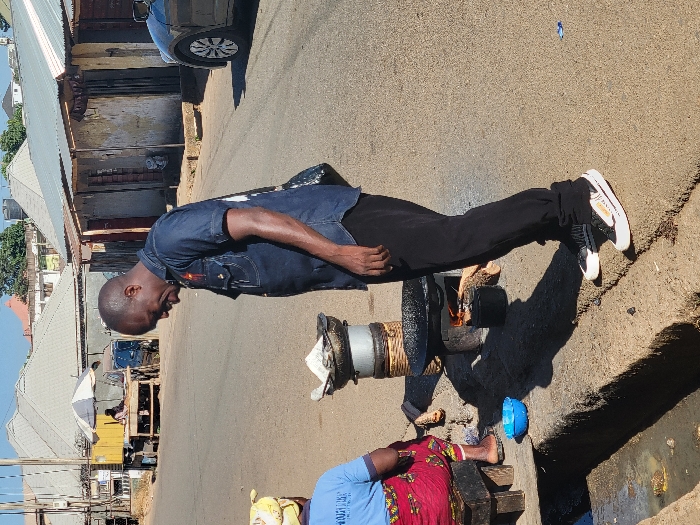 This image captures a daytime street scene in a semi-urban area of Jos, Nigeria. In the foreground, a dark-skinned male subject with a shaved head is standing on an asphalt pavement. He wears a short-sleeved blue denim shirt with a red pin on the left chest pocket, black trousers, and black and white sneakers with white soles and a yellow accent stripe. He is angled slightly left, looking downwards, with a faint smile on his face. A black shoulder bag hangs over his right shoulder. To the male subject's immediate left, a dark-skinned female subject is partially visible, seated on a low wooden stool. She wears a blue top, a red patterned wrapper, and a yellow headscarf, facing away from the camera. Her bare feet are visible near an open concrete drainage ditch that runs along the roadside, containing dark liquid and debris. A small, light blue plastic bowl rests on the edge of the ditch. Between the two subjects, a cooking setup is present on the ground. A large, black, round pot (karahi-style) sits on a makeshift wood-fired stove, with visible flames and smoke from burning wood logs. Contents within the pot are partially obscured by paper or cloth. Beneath this pot, a silver pot is stacked on a woven basket. The background reveals a street with various structures and activities. A dark-colored car is parked on the right side of the asphalt road. A row of single-story buildings with weathered walls and corrugated metal roofs lines the right side of the street. On the left, further back, a yellow structure (possibly a kiosk or truck) is visible, near which a person sits under a white and light blue/grey striped umbrella. Utility poles with overhead wires are present, and a black water tank is visible on a distant rooftop.