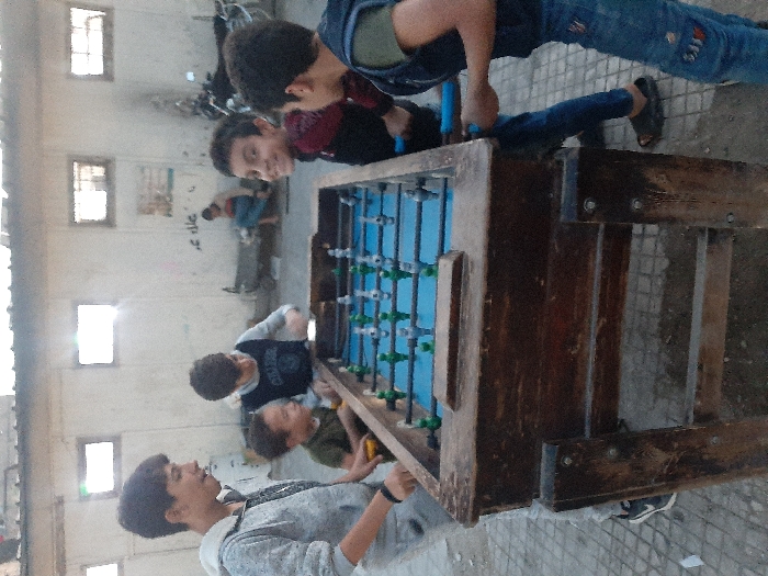 The image depicts an outdoor area in Al-Qadam Municipality, Syria. Five individuals are present. In the foreground, a dark wooden foosball table with a light blue playing surface and green and light blue player figures occupies the center. Four boys/young males are actively engaged around the table. From the left, a male in a grey hoodie observes, alongside a younger male in an olive green t-shirt. Opposite them, a male in a dark red long-sleeved shirt smiles towards the camera while holding a foosball rod, next to another male in an olive vest over a dark long-sleeved shirt, also holding a rod. A fifth male in a dark sleeveless top is positioned behind the table's far end. The ground is paved with light-colored square tiles. In the background, a light-colored building wall with three rectangular windows is visible, bearing Arabic script that reads "علاء عمر". A seated individual, partially obscured by blue fabric, is visible against the background wall to the right of center. A motorcycle is parked near the wall on the far right. The scene is illuminated by bright ambient light.