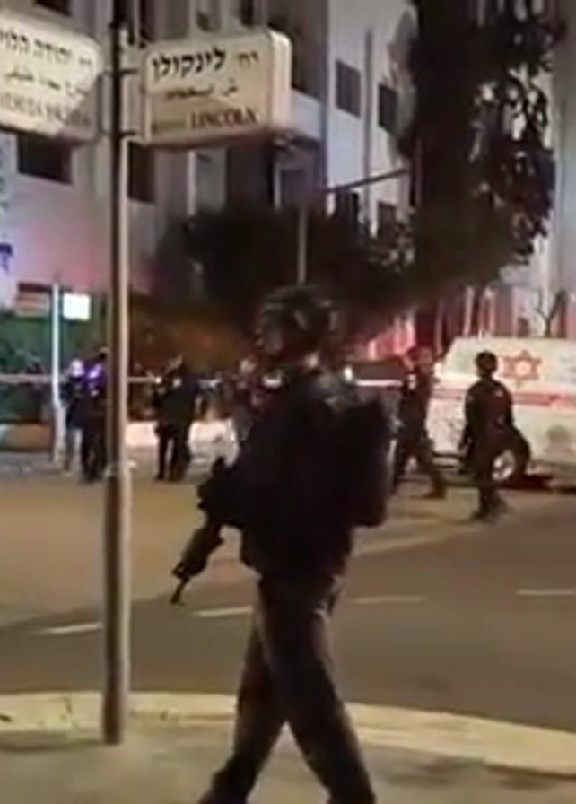 The scene appears to be at night on a city street corner, indicated by street signs labeled "Yehuda Halevi" and "Rehov Lincoln." The street is lined with buildings, some of which are tall. A man is shown in the foreground holding what appears to be a rifle and wearing tactical gear. In the background, a group of people are visible near an ambulance, and several individuals who appear to be law enforcement officers are also present. There is police tape strung across the road, indicating a potential crime scene or area of concern. A stop sign can also be seen. The overall environment suggests a state of alert or security presence.