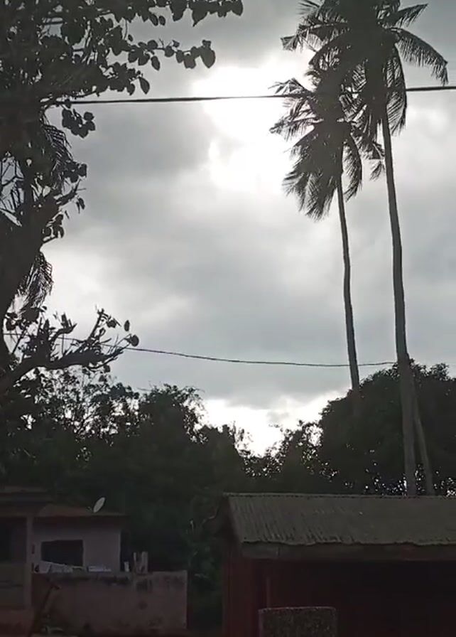 The scene displays a cloudy sky with visible tree silhouettes, including palm trees, and a glimpse of buildings underneath. Power lines stretch horizontally across the frame, partially obscuring the view. The sky is heavily overcast with a diffused sunlight trying to penetrate through the cloud cover. The buildings below appear to be modest structures with corrugated roofing, and are partially obscured by foliage.