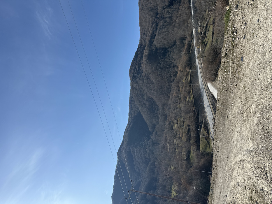 The scene depicts a mountainous, rural landscape located in Unknown, Greece, under a clear, bright blue sky with minor wispy cloud formations visible in the upper left quadrant. The sun is positioned in the upper left, illuminating the area. Dominating the background are multiple large mountains, densely covered with bare deciduous trees, suggesting late autumn, winter, or early spring. These slopes exhibit varying degrees of sunlight and shadow. In the midground, a paved, two-lane road (likely asphalt) with guardrails on both sides curves from the center-left, descending towards the right. The road is clear of traffic. It is lined with multiple dark-colored streetlights or utility poles. Below and to the right of the paved road, a smaller, unpaved dirt track or embankment is visible. The immediate foreground consists of a rough, elevated terrain composed of light-colored gravel and dirt. On the left side of the frame, a wooden utility pole stands vertically, from which several dark, horizontal power lines or communication cables extend across the sky to the right. No individuals, vehicles, or animals are present in the observed environment. The vegetation on the lower slopes and near the road consists primarily of dormant bushes, sparse dry grass, and additional bare trees. The overall environment is illuminated by direct sunlight, with distinct shadows visible on the mountain contours.