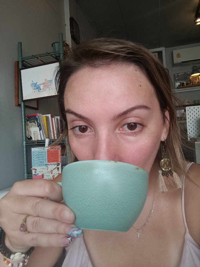 A female subject, approximately 20-40 years old, with brown hair and brown eyes, is depicted in a medium-shot, selfie-style photograph. She wears a light-colored tank top, a gold-colored chain necklace with an 'F' pendant, and a large, tasseled earring on her left ear. Her right hand, adorned with a ring and multiple beaded bracelets, holds a textured light-green ceramic cup to her mouth, obscuring her nose and lower face. Her right thumbnail features a multi-colored abstract design. The background indicates an indoor commercial establishment, likely a cafe, located in Bangkok, Thailand. This assessment is supported by the visible white split-system air conditioning unit and a poster with discernible Thai script on a shelf. To the left, a dark metal shelving unit holds various books and a framed illustration of two figures seated. To the right, shelves display decorative objects, and a metal-shaded hanging lamp is visible. The wall surfaces present a mix of light gray and darker gray tones. The subject's action involves consuming a beverage from the cup.