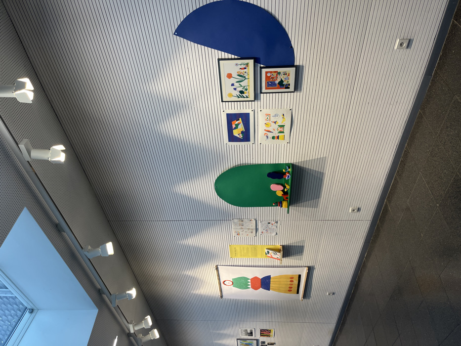 This image depicts an interior exhibition space or corridor in Sélestat, France. The view is along a wall with light-colored, horizontally grooved panels. The ceiling is white and perforated, featuring a track lighting system with multiple white spotlights directed towards the wall. A rectangular skylight is visible in the upper left section of the ceiling. The floor is composed of dark grey or black square tiles. The wall displays an arrangement of artworks and decorative elements: 1. **Left-center:** A large vertical poster, framed in light brown, features a stylized figure composed of stacked geometric shapes in green, red, orange, blue, and yellow, on a light background. 2. **Right of the poster:** A vertical yellow panel with black text, likely an informational sign. Below it, a small white shelf holds two small, unidentified items, possibly books or cards. 3. **Further right:** Several small, unframed drawings are taped directly to the wall. 4. **Center:** A prominent green arch-shaped panel is mounted on the wall. Beneath its arch, a flat green shelf protrudes, supporting approximately six small, colorful, abstract figurines, possibly resembling birds, in shades of blue, red, yellow, and green. 5. **Right of the arch:** A cluster of four framed artworks: * **Top left:** A horizontal print with abstract colorful shapes on a dark blue background. * **Top right:** A vertical print depicting stylized flowers and figures on a white background. * **Bottom left:** A square print featuring stylized colorful figures and objects on a white background. * **Bottom right:** A vertical print illustrating a detailed scene with figures and structures. 6. **Far right:** A large, solid blue, semi-circular or quarter-circular panel is mounted on the wall. Several white electrical outlets are visible on the lower portion of the grooved wall panels. No individuals are present in the scene.