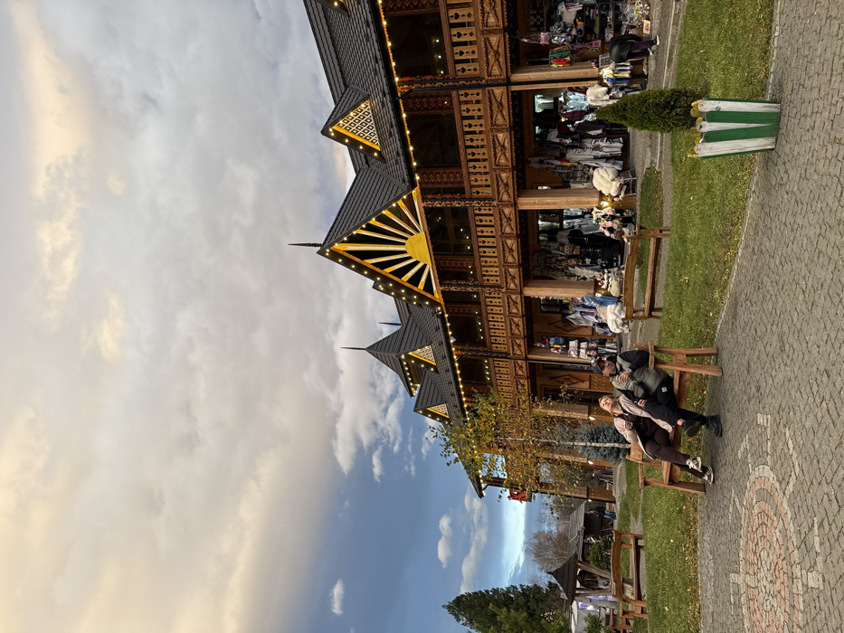 The scene depicts the Yaremche Souvenir Market in Yaremche, Ukraine, under an overcast sky displaying both blue and warm golden light. In the lower-left foreground, on a patterned paved surface, a male and female are seated on a rustic wooden bench. The female, positioned on the left, wears a light-colored jacket and dark pants, resting her head on the male's shoulder while holding a light cup. The male wears a dark baseball cap, a grey vest over a dark long-sleeved shirt, and dark pants, holding a dark cup. Dominating the background is a multi-story building constructed in traditional Hutsul wooden architectural style. This structure features extensive dark wood carvings on its balconies, railings, and facade elements. Its dark tiled roof exhibits multiple gables and pointed spires. String lights illuminate the rooflines and decorative features, including a prominent central gable adorned with a sunburst motif. The ground and first floor levels of the building are lined with open-fronted market stalls displaying various merchandise, including textiles, furs, and crafts. The surrounding environment includes areas of green grass interspersed with additional empty wooden benches. A tall conifer stands on the far left, and a deciduous tree with sparse, light-colored leaves is positioned behind the seated couple. A small, conical evergreen bush is situated in a green and white striped wooden planter on the right side of the paved area. Blurred figures are visible near the market stalls in the mid-ground, indicating general activity.