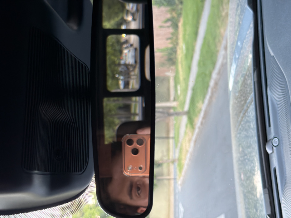 A vehicle's interior is captured, focusing on the rearview mirror. The mirror reflects a person holding a phone, along with an outside view of a road, sidewalk, and grassy area. The car's dashboard and side window are also visible, displaying interior detailing. The image is taken from inside the vehicle, looking towards the rearview mirror and capturing the exterior environment through its reflection.