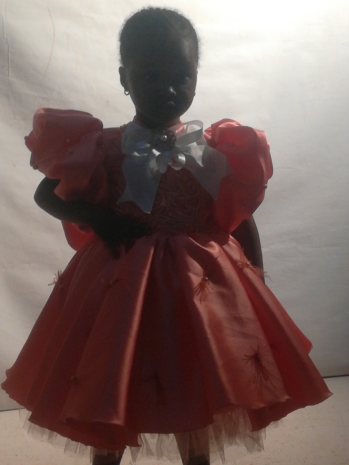 A young child, appearing to be a girl, stands upright and centered, facing the camera against a plain, light-colored background. The child's face and upper body are heavily silhouetted due to backlighting, obscuring specific facial features, though small hoop earrings are visible in both ears. The child is wearing a structured, coral-colored dress with prominent puffed sleeves. A light blue or white bow with a central decorative element is affixed at the neckline. The full, pleated skirt of the dress is adorned with several small, brownish, spider-like ornaments, and a layer of light-colored tulle petticoat is visible beneath the hem. The scene is located in Unknown, Unknown.